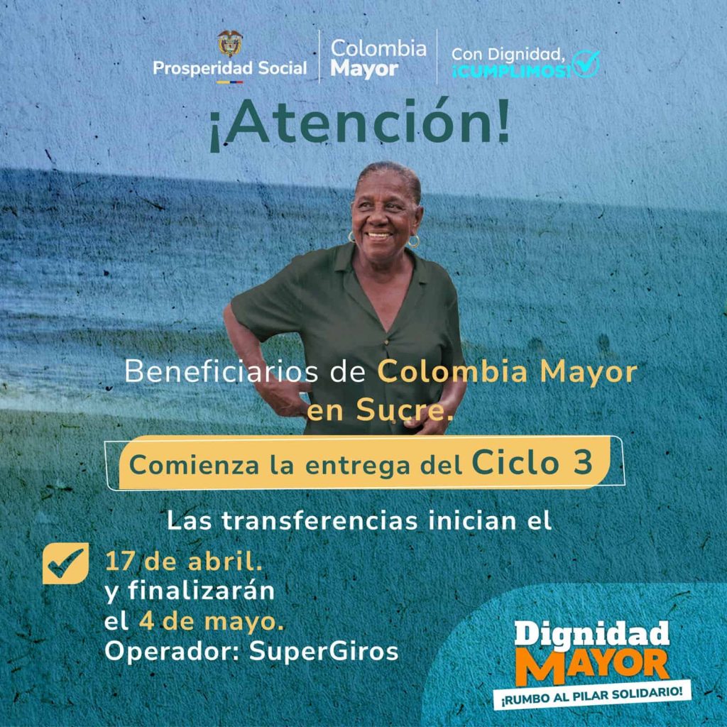 Sucre, Sincelejo, 15 de abril de 2026. El director de Prosperidad Social, Mauricio Rodríguez Amaya (@mao_rodriguez1), informó que el tercer ciclo de transferencias del programa Colombia Mayor iniciará el próximo 17 de abril y finalizará el 4 de mayo: “Seguimos cumpliendo nuestro compromiso con las personas mayores del país, garantizando la entrega oportuna de los recursos y avanzando en mecanismos más seguros y directos para su acceso”.